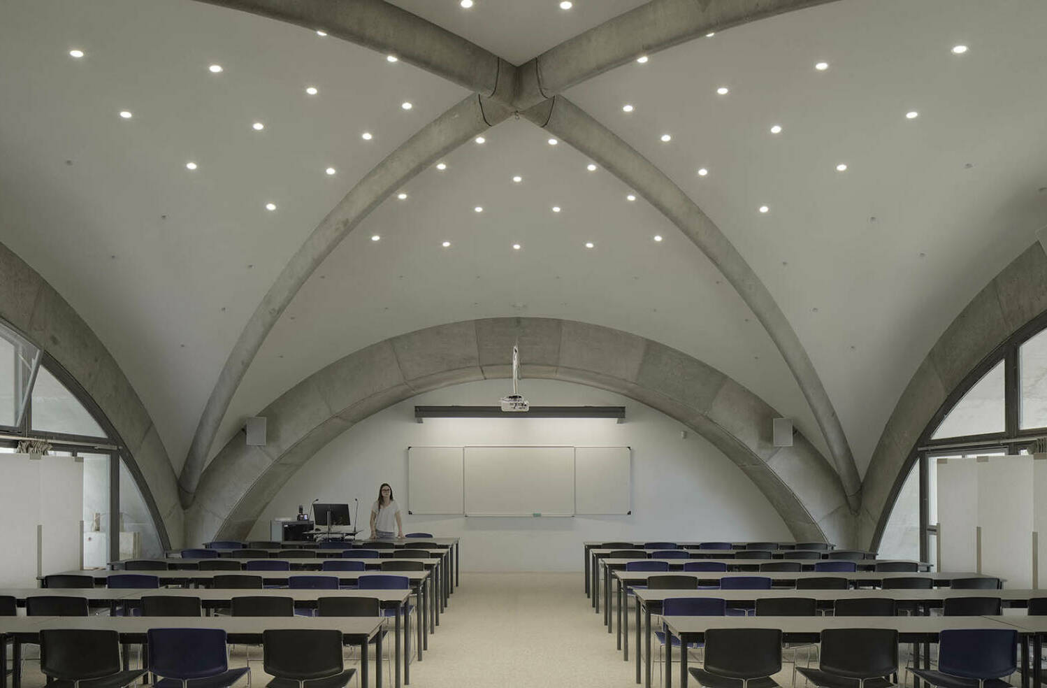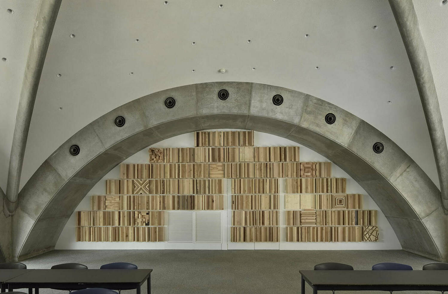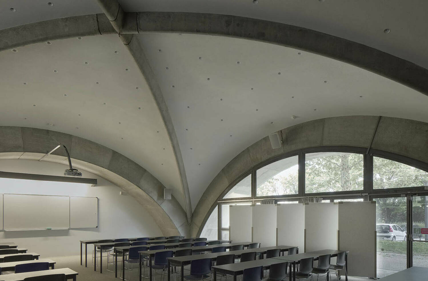 L’ENSAL a entrepris la rénovation acoustique de l’une de ses salles de cours avec comme objectifs : diminuer le bruit de fond, faire chuter la durée de réverbération, éviter les échos flottants. La salle de cours voutées a nécessité la pose d’un plafond absorbant, le doublage de l’éclairage, la pose de panneaux déflecteurs devant les ouvertures vitrées, la pose de diffuseurs acoustiques en bois de réemploi biosourcés, la pose de plafonds acoustiques ainsi que pulvérisation d’un enduit acoustique.