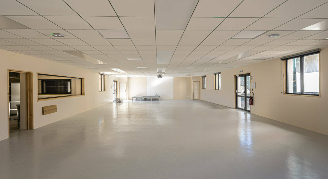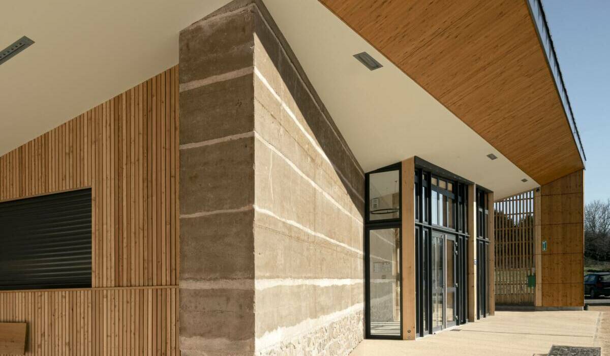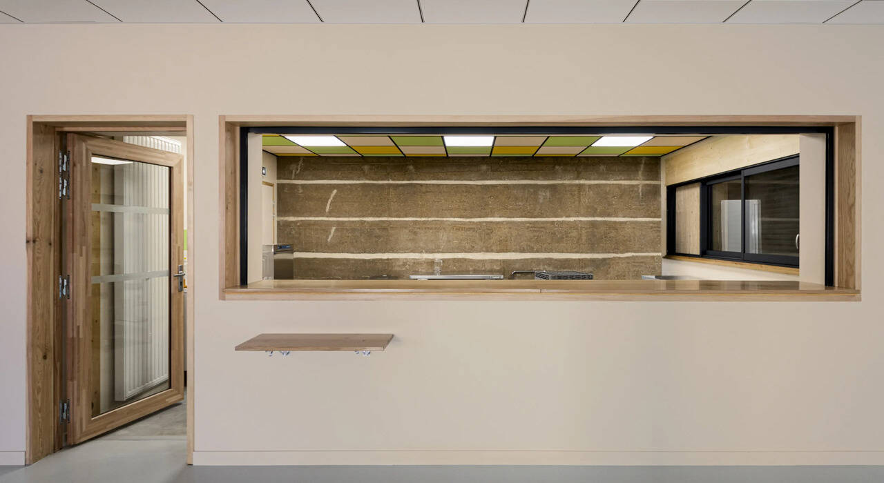Ce programme valorise les matériaux bio et géo-sourcées locaux. Un soubassement en pierre permet l’assise d’un mur en pisé. Les matériaux proviennent d’un ancien bâti déconstruit dans le village. Le volume d’extension est conçu en murs ossatures bois et charpente traditionnelle en sapin massif du Puy-de-Dôme. Un traitement de façade sur le pignon Est vient harmoniser la façade existante et l’extension par un traitement continu. Le bardage extérieur est réalisé en mélèze ajouré d’Auvergne-Rhône-Alpes. Le débord de toit offre une couverture sur les espaces extérieurs, tels que le bar et la circulation. Ce débord permet la protection en saison estivale de la surchauffe de l’extension et assure la captation des calories du soleil en hiver. L’esplanade extérieure dialogue avec un aménagement urbain à venir et ouvert vers le patrimoine local. L’isolation végétale du bâtiment est composée de chanvre, lin et coton, ainsi que de Ouate de Cellulose.