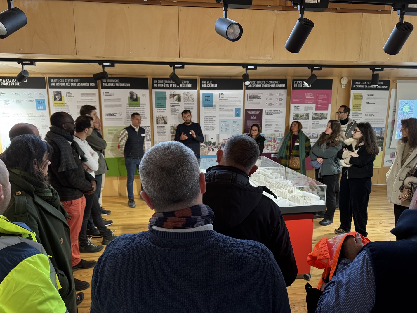 La matinée a débuté à la Maison du Projet, où les participants ont pu échanger autour de la maquette du quartier Gratte-Ciel, illustrant l’ambition du projet : doubler le centre-ville de Villeurbanne avec la construction de nouveaux équipements publics, tels qu’un lycée, un groupe scolaire, une crèche, un cinéma et un pôle jeunesse.